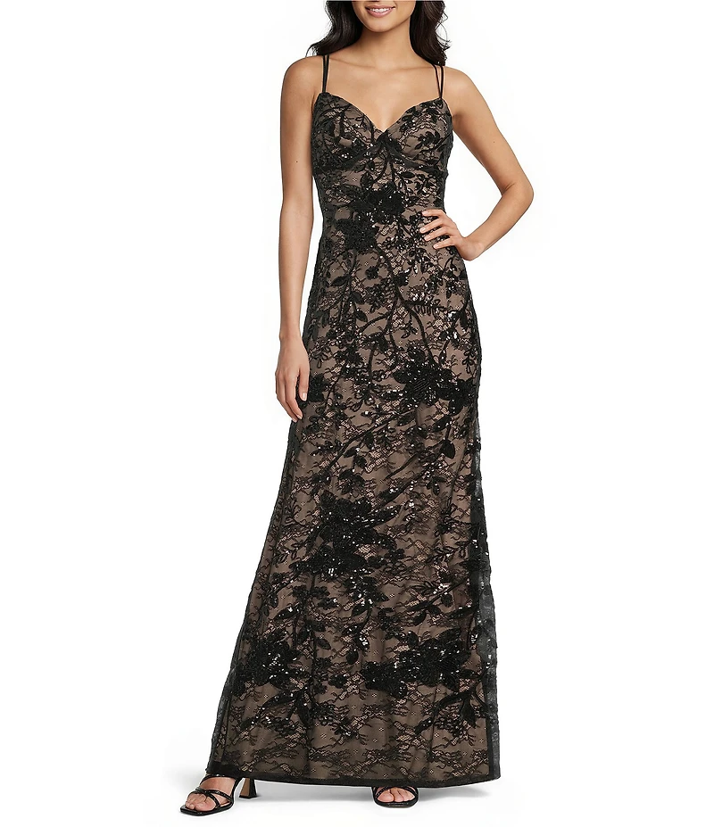 From B. Darlin, this ballgown features: Sequined lace fabric V-neckline Double spaghetti straps Godet insets Zip and lace up back closure Approx. 64" length Nylon/spandex; polyester lining Hand wash/line dry Imported.