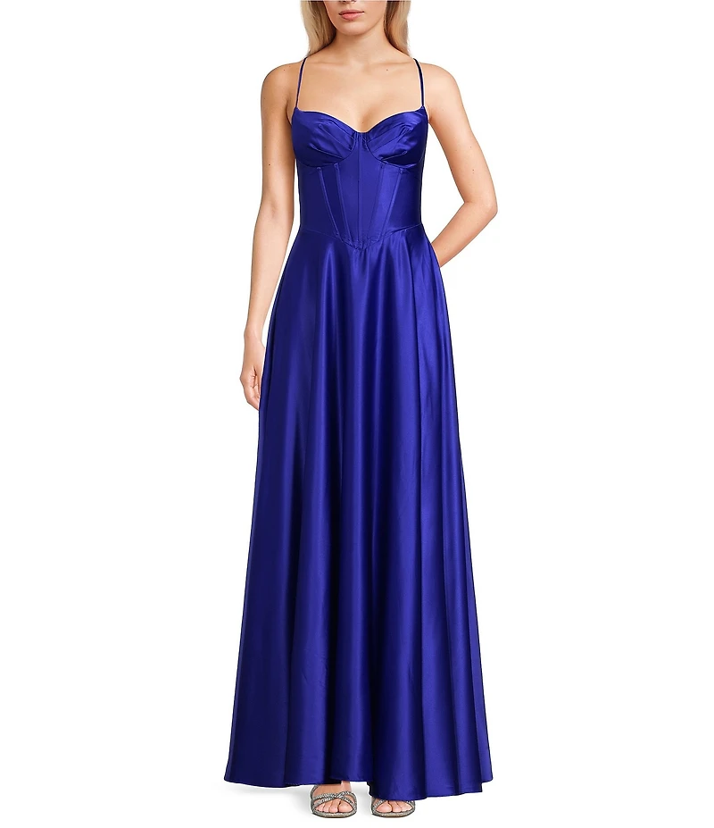 From B. Darlin, this dress features: Sweetheart neckline Sleeveless Spaghetti straps Corseted bustier bodice Side slit Zip and lace up back closure 64" length Polyester/spandex; lined Machine wash/line dry Imported.
