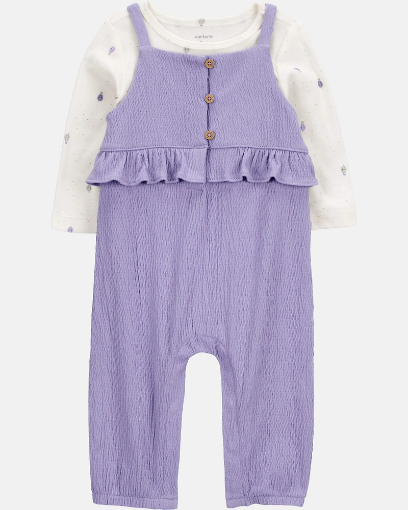 This 2-piece set keeps things sweet and simple while handling the everyday messy magic of baby life. The relaxed-fit long-sleeve tee is all about cozy comfort, while the straight-cut coverall brings the charm in soft, solid purple. It's comfy enough for naps and charming enough for spontaneous photo ops. Just zip or snap it on and go - no assembly required.