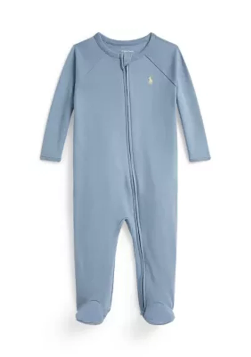 This essential one-piece is crafted with ultrasoft cotton interlock and embroidered with a signature Pony. 100% cotton. Machine washable. Size 9 months has a 25.25" body length (front and back) and a 15.5" sleeve length. Sleeve length is taken from the center back of the neck. Signature embroidered Pony at the left chest. Crewneck. Zip placket extends to the hem. Long raglan sleeves with turnback mitts. Footed silhouette. Imported. Imported Material & Care 100% cotton Machine washable