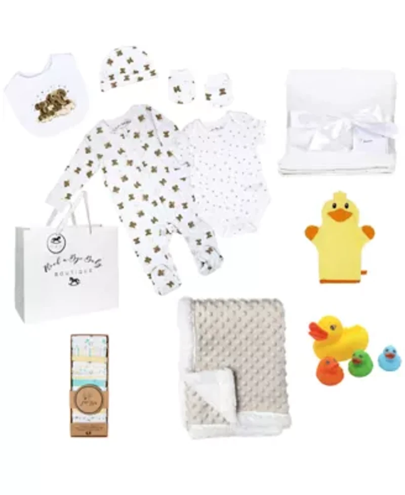 This complete baby gift set for the newborn includes many essential items to get ready for baby! 28 piece set includes one long sleeved sleeper, one short sleeved bodysuit, one beanie cap, one plush stroller blanket, one bib, one set of anti-scratch mitts, 4 ducky bath toys, sixteen baby washcloths, one baby wash mitt, and one hooded bath towel. Also includes bonus gift bag and tissue paper for easy gifting. Neutral and yellow duck theme. All pieces are easy care, machine wash and dry. Clothing items fit baby 0-3 months. 28 Snap closure Crew neck China Imported Material & Care Cotton/PolyBlend Machine washable