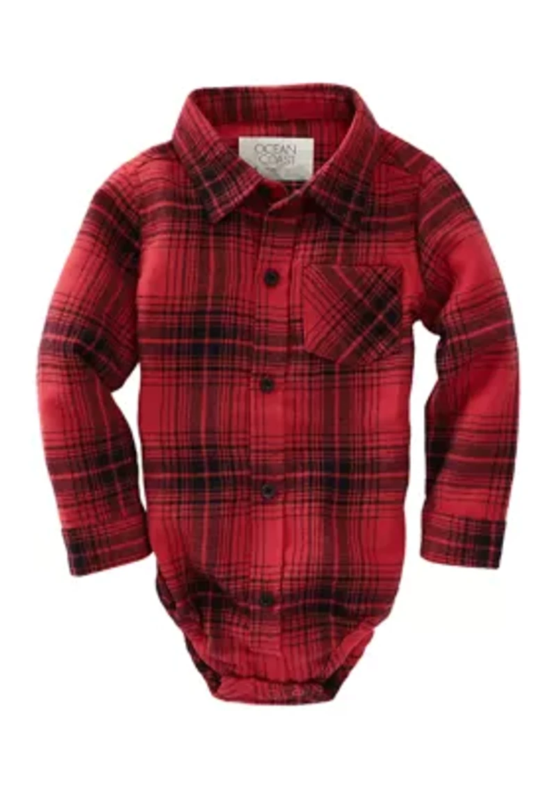 Fashioned in flannel, this cozy long sleeve bodysuit from Ocean & Coast® is made to give your little guy a handsome look. Button closure Snap closure Collar Long sleeves with button cuffs Imported Belk Exclusive Material & Care Cotton Machine washable