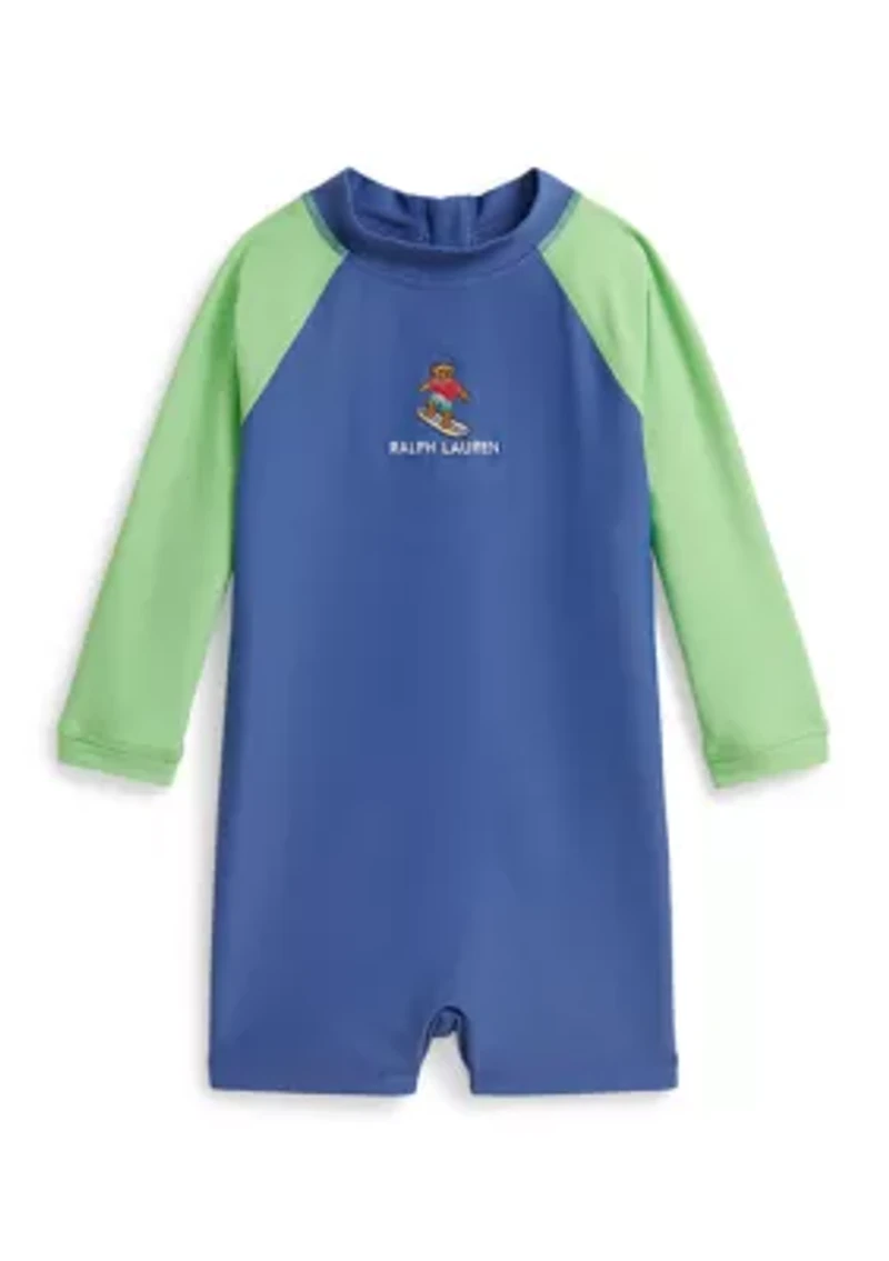 This rash guard shortall is made from a stretch-enhanced fabric that wicks away moisture for added comfort. Concealed ring snaps at the hem Polo Bear and “Ralph Lauren” embroidered at the center front Long raglan sleeves Quarter-zip placket at the back of the neck; zipper pull custom-developed with a “Polo” logo Imported Material & Care 81% nylon, 19% elastane Machine washable