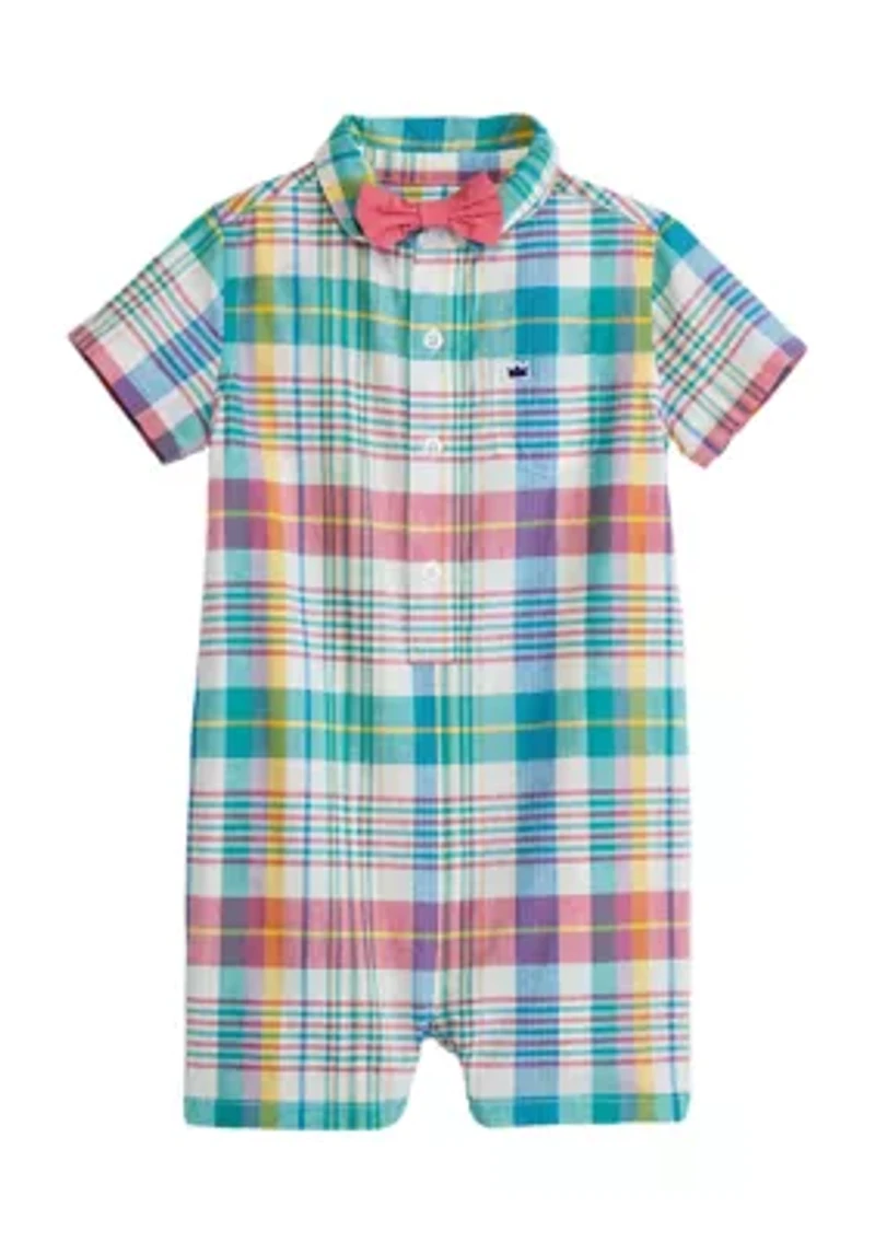 Your little man will look oh-so-handsome when he wears this plaid romper from Crown & Ivy™ finished with an adorable bow tie. Snap closure Collar Short sleeves Imported Belk Exclusive Material & Care Cotton, polyester Machine washable