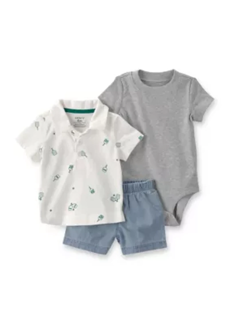 Versatile and effortlessly stylish, this Carter's® set is perfect for little ones on the go. The all-over pickleball print adds a ton of fun for your sporty family, and neutral colors make it easy to mix and match with other wardrobe favorites. Ideal for warm days, the breathable materials keep kids cool, letting them enjoy every adventure without a worry. Parents appreciate the easy-dressing features, making getting ready a breeze. 3-piece set Top: pullover, collar, short sleeves Body suit: short sleeves Shorts: pull on Imported Material & Care Cotton, polyester Machine washable