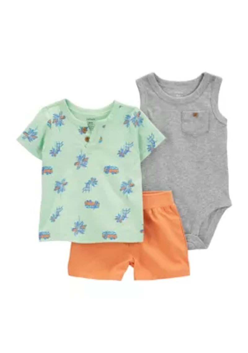 Made to match, this pack of three is complete with a henley tee, cotton-blended bodysuit, and a coordinating diaper cover. 3-piece set. Short sleeves. Henley-style neckline. Strong snaps keep up with wear, wash, repeat. Covered elastic waistband for a comfy fit. 3-piece set Imported Material & Care Cotton, polyester Machine washable