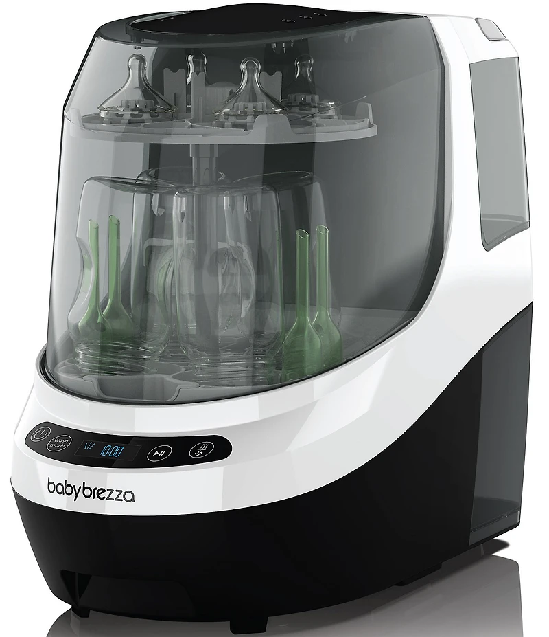 From Baby Brezza, this bottle washer features:  All-in-One Cleaning: Automatically washes, sterilizes & dries bottles, pump parts, sippy cups & accessories inside & out Only Bottle Washer Clinically Proven to Clean Bottles 100%: Independent lab testing showed that bottles had 0% milk residue after one wash, sterilize & dry cycle in the Bottle Washer Pro; Other brand washers leave 10%+ milk residue after a complete cycle. Only bottle washer clinically proven to clean significantly better than a bottle brush Hands-free washing saves you valuable time Powerful & Fast Cleaning: 20 high-pressure spray jets precisely wash all surfaces & hard to reach corners Kills 99.9% of germs with steam & dries with HEPA-filtered, germ-free hot air Washes & rinses in 19 minutes. Products stay sterilized for 72 hours No Sink Hook Up Required, Easy to Use: No messy drain hose Includes removable clean & dirty water tanks for use anywhere in your kitchen or around the house Transparent lid lets you see inside & watch as it cleans Built-in wheels for easy turning Universal Capacity: Holds 4 bottles, pump parts, sippy cups & accessories Fits virtually all brands (excludes wearable pump parts, straw cups) Never scrub or use a bottle drying rack again Product size: 9.8”W x 18.5”D x 15.3”H 1 year limited warranty 6 Eco-Friendly Cleaning Modes: Wash, Sterilize & Dry; Wash & Dry; Wash Only; Sterilize & Dry; Sterilize Only; Dry Only Uses 85% less water than hand washing LCD control panel Works only with Baby Brezza Detergent Tablets (machine includes 60 tablets) Imported.