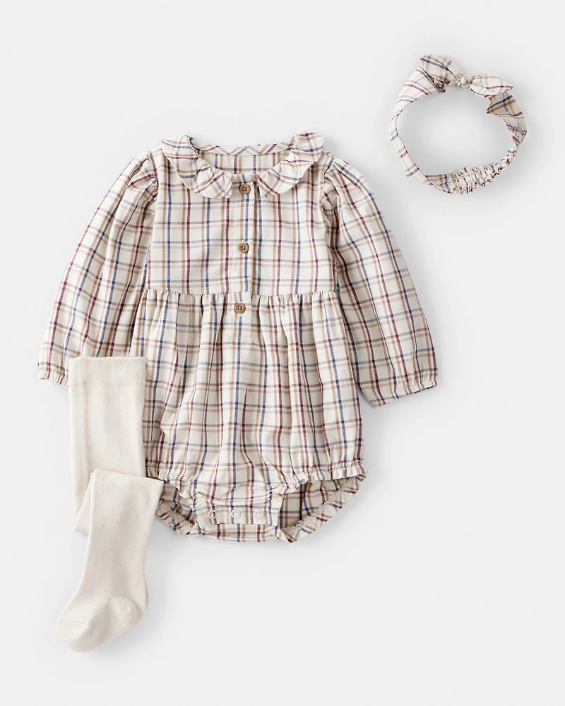 Dress your little one in effortless charm with this delightful plaid romper set. Designed for casual outings, the soft, breathable fabric ensures all-day comfort, while the snug fit allows for easy movement during playtime. Featuring a timeless small-scale print, this outfit is perfect for any season, making it a versatile addition to your child’s wardrobe. Complete with a matching headband and cozy socks, it’s the perfect ensemble for family gatherings or fun days out. Parents appreciate the easy-dressing features, while kids adore the playful style.
