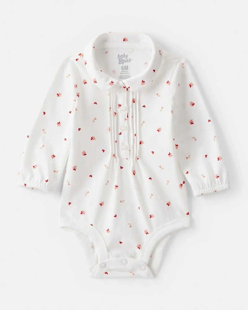 Designed with a floral and heart print, this bodysuit brings effortless style to her wardrobe. The Peter Pan collar and pintuck details add a fashionable touch, while elastic sleeve openings ensure a comfy fit. Functional buttons and strong snaps at the legs make changes a breeze. Pair with denim to complete the look.