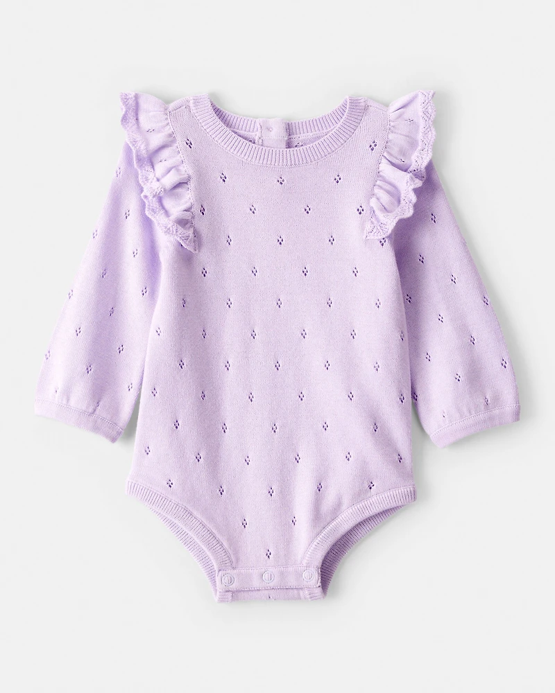 A style-forward layer made for her big debut. This lavender bodysuit channels runway vibes with delicate pointelle stitching and playful ruffles at the shoulders for a chic finish. Strong snaps at the legs make changes quick and easy, while long sleeves add cozy coverage for cooler days. Style it with soft knit leggings or a skirt for an effortless look.