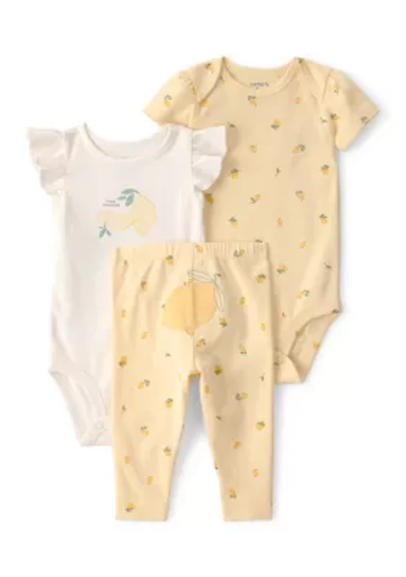 Elevate your little one's casual wardrobe with this charming set, designed for comfort and playful style. Featuring delightful lemon print and a slogan on the bodysuit, these three colorful pieces are perfect for mixing and matching. Easy to put on and take off, they make dressing a breeze for busy parents. Whether it’s playtime at the park or a cozy day at home, this outfit is a go-to favorite for every occasion. 3-piece set featuring all-over lemon prints and "fresh squeezed" slogan for a cheerful, playful look Soft cotton fabric ensures all-day comfort for your little one Overlap shoulders for easy over the head on a yellow bodysuit Ruffled sleeves on a white bodysuit add a stylish touch to casual outfits Covered elastic waistband and lemon art on the bottom Color: Yellow/White 3-piece set Pullover Crew neck Imported Material & Care 100% cotton Machine washable
