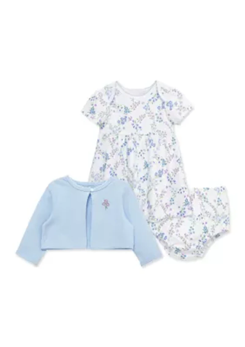 Beautiful flowers flourish on Little Me's baby girls' 3-piece cotton dress set! The set includes the floral dress and matching panty. Add the coordinating cardigan for added flair and comfort! 3-piece set Pullover, elastic waistband, button closure Crew neck Imported Material & Care 100% cotton Machine washable