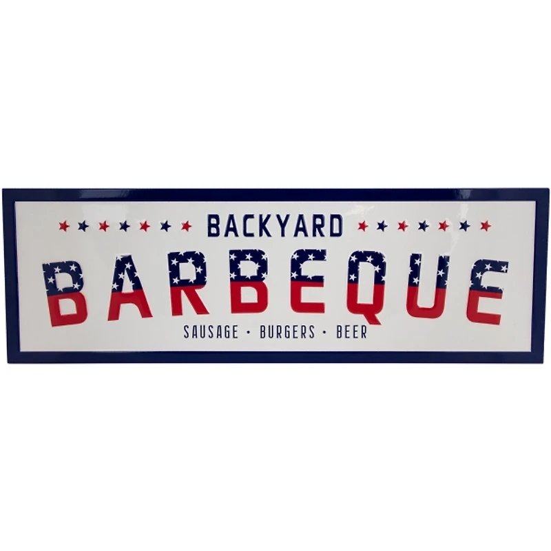 Invite the whole neighborhood to your 4th of July gathering with this Backyard Barbeque Metal Wall Plaque! You'll love how it adds Americana charm to the kitchen! Overall dimensions Width: 23 in. Depth: 0.5 in. Height: 7.5 in. Crafted of metal Dark blue frame finish White background finish Features the text "Backyard Barbeque Sausage Burgers Beer" Star accents Hues of red, white, and blue Weight: 1.2 lbs. Hangs from back-mounted hardware Care: Dust with a soft, dry cloth. This item is available at Kirklands.com only, not available in stores. Please note: this item cannot be shipped to APO/FPO addresses.