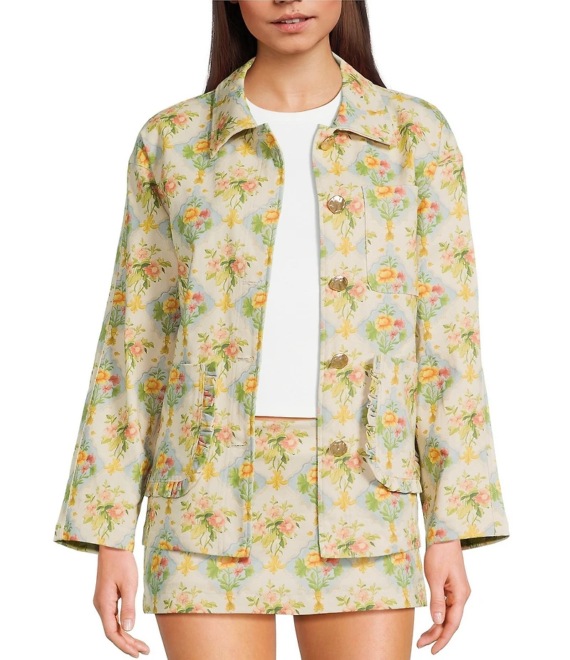 From Baily Rose, this jacket features: Allover floral print Point collar Long sleeves Button-front closure Cotton/polyester Hand wash Imported.