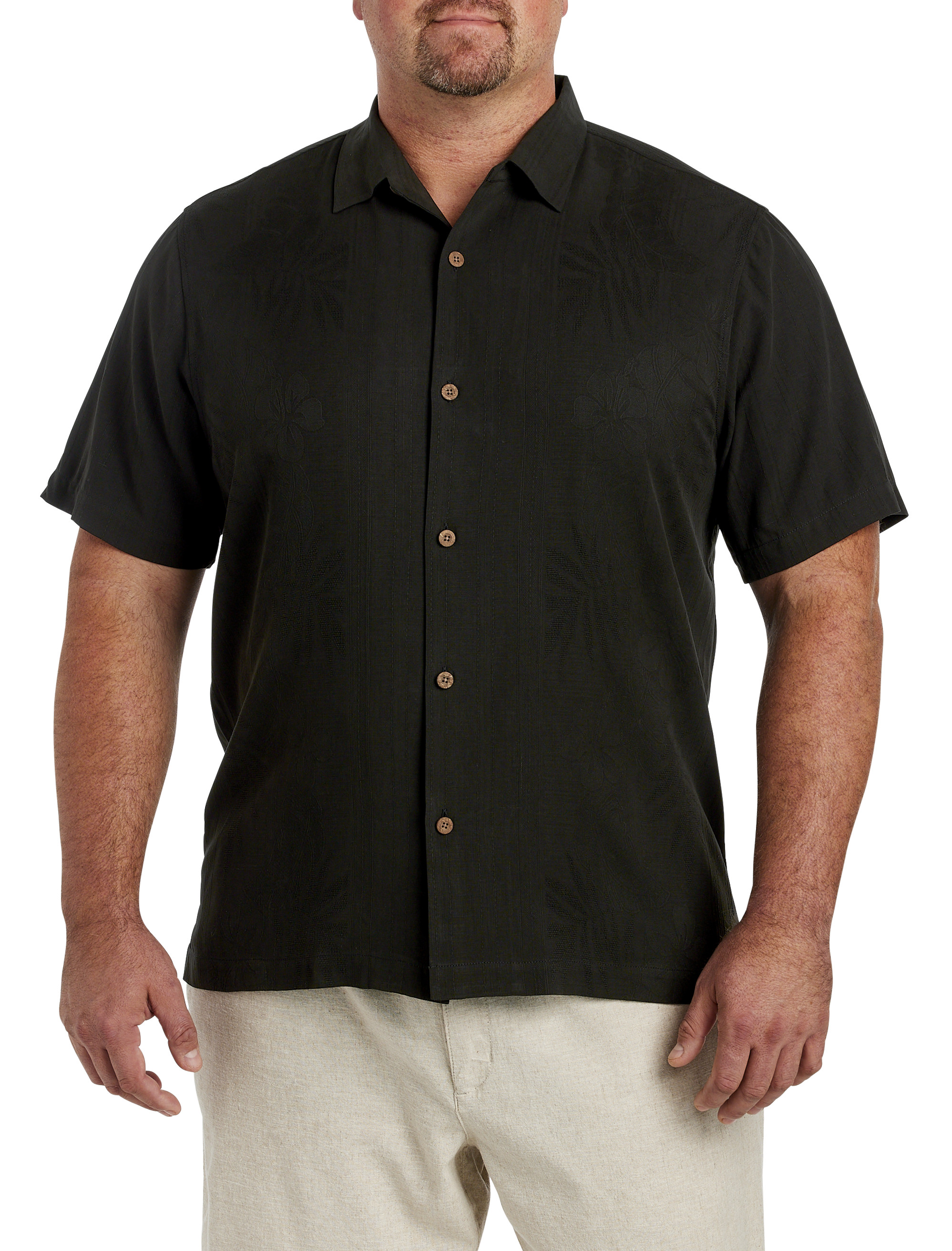 Rich color, soft silk, a tropical-inspired jacquard pattern and island style—this camp shirt from Tommy Bahama fits you perfectly. Throw it on and feel like you're on vacation, whether you're out on the town or on the shores of paradise. Crafted of 100% silk for a luxe feel, it's a must-have style for every man's collection.