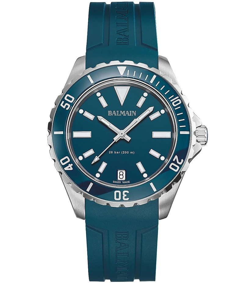 From Balmain, this men's watch features: Round case shape Rubber strap Stainless steel case Quartz analog movement Buckle closure Case size approx. 42mm Water-resistant up to a pressure of 20 bar (200 M / 660 Ft) Swiss made Imported.