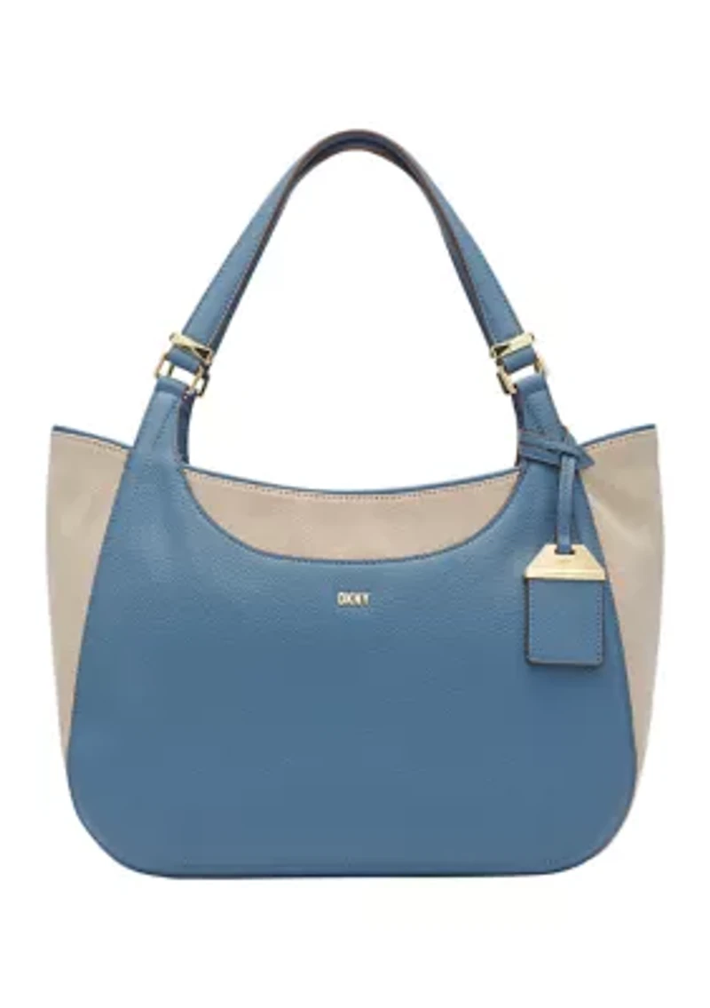 Step up your style with effortlessly chic style when you pair your looks with this trendy two-tone bag from DKNY. Featuring interior zip and slip pockets, this bag is a great choice for all occasions. Snap closure Crossbody strap with 23'' drop Exterior: logo charm Interior: front and back zip/slip pockets Imported Product Specifications 13.38'' L x 10.62'' W x 5.31'' H Material & Care Canvas trim Polyurethane Spot clean only