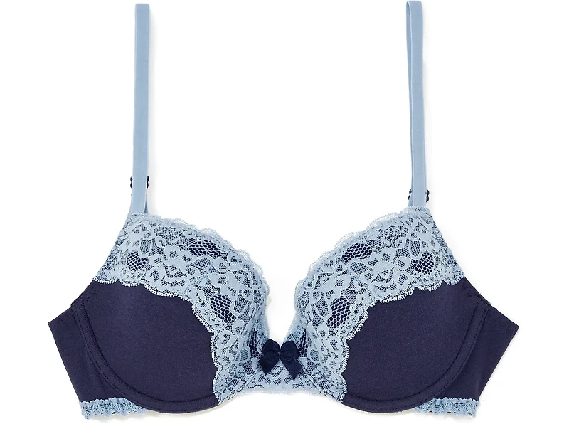 Meet your new favorite everyday demi bra. The Barnie has soft cups with wide lace trim detail, making it both comfortable and flirtatiously feminine. Pair this Patriot Blue Contour Demi with the matching bikini or hipster panty for a complete look. (Available in sizes 30A-38DD.)