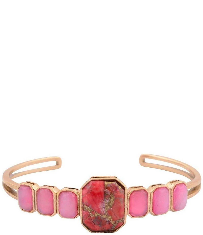 From Barse, this bracelet features:  Cuff bracelet Bronze metal Metal infused red magnesite and pink quartz stones Open, no closure  Approx. 2.5" diameter  Imported.