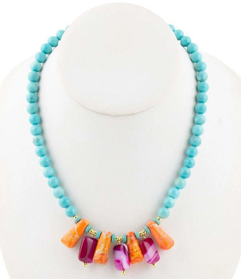 From Barse, this necklace features: Short multi strand necklace Gold tone hardware Genuine turquoise magnesite and jasper agate Lobster clasp closure Approx. 16" length Imported.