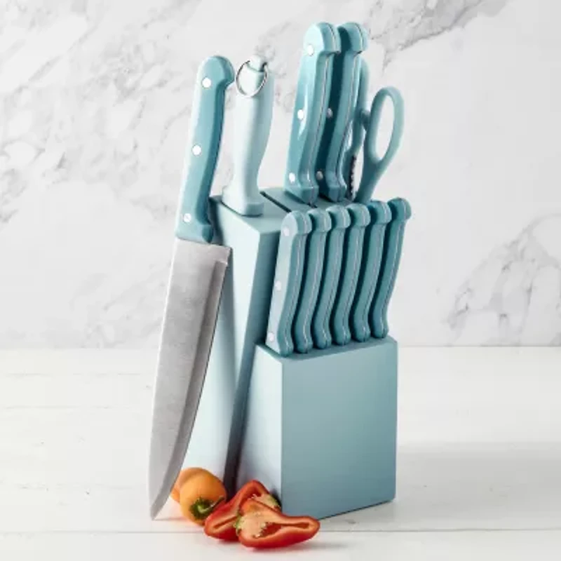 Designed for comfort and durability, these stainless-steel knives have tempered blades that are ground to an ultra-fine edge. The 7.5 chef knife, 7-inch santoku, and 8-inch bread knife are essential for most everyday cutting tasks. The Santoku knife combines the qualities of a vegetable cleaver and a chef knife for precise chopping and slicing. Steak knives make cutting through cooked meats easy with a sharp, serrated edge. The pine wood knife block organizes knives, protects the blades, and keeps them easily accessible.