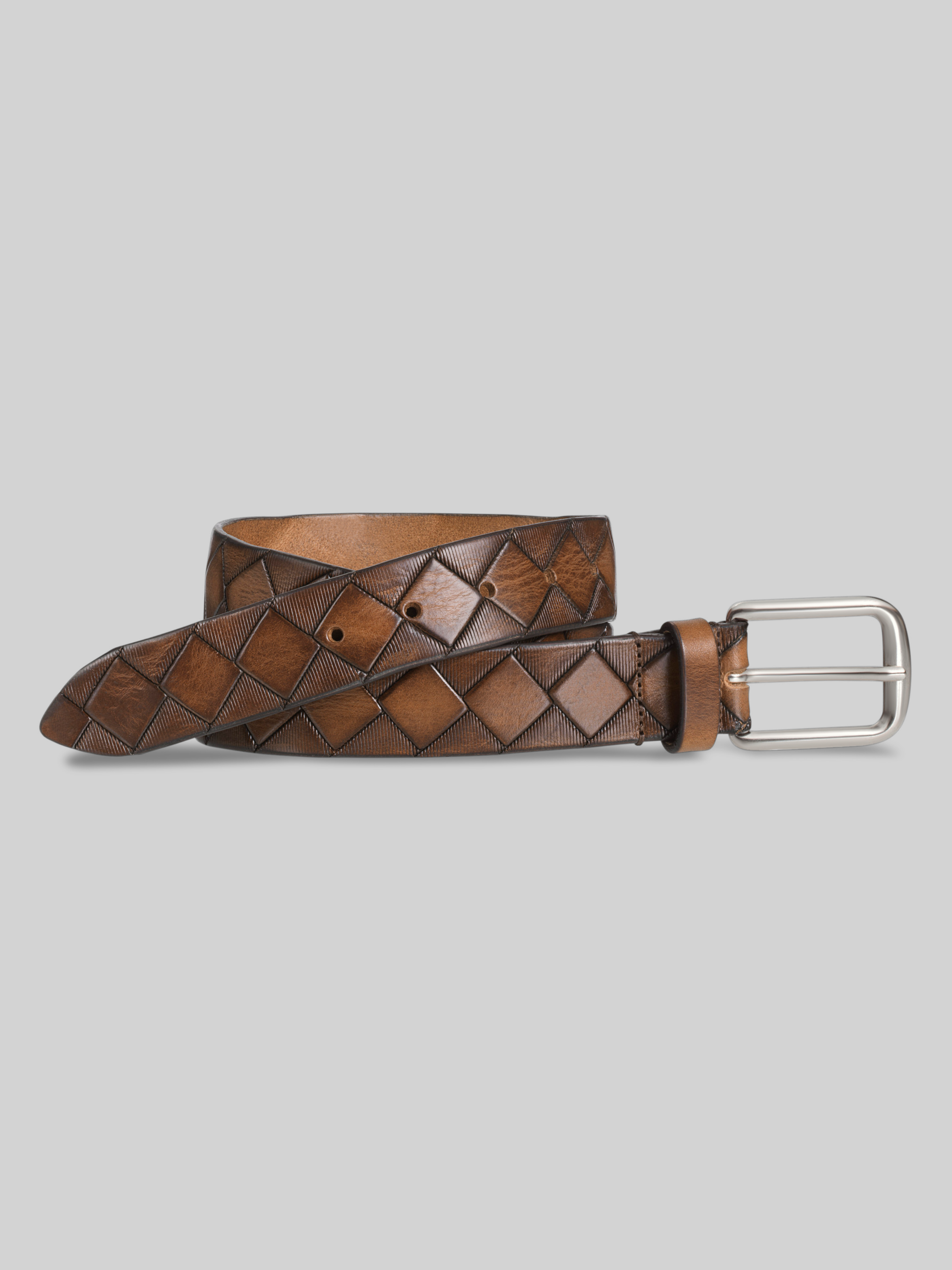 A rich blend of texture and craftsmanship. Made in Italy, this belt features embossed leather that's been artfully burnished and stained to achieve a sophisticated woven look. The 1 3/8-inch width offers a tailored profile, while a brushed-nickel buckle adds a modern finish. It's a standout accessory that brings depth and distinction to both casual and dress looks.