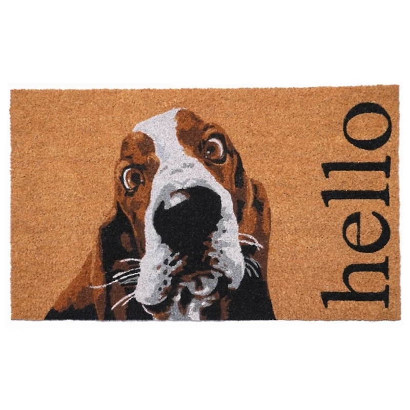 Let your favorite furry friend welcome guests to your home with this Basset Hound Hello Doormat. You'll love having this sweet pup waiting to greet you every day! Doormat measures 36L x 24W x 0.6H in. Crafted of coir with a vinyl backing Features a Basset Hound Reads "Hello" Hues of brown, black, and white All-season, colorfast, and weather tolerant Safe for outdoor use Care: Vacuum or sweep clean. This item is available at Kirklands.com only, not available in stores. Please note: this item cannot be shipped to APO/FPO addresses.