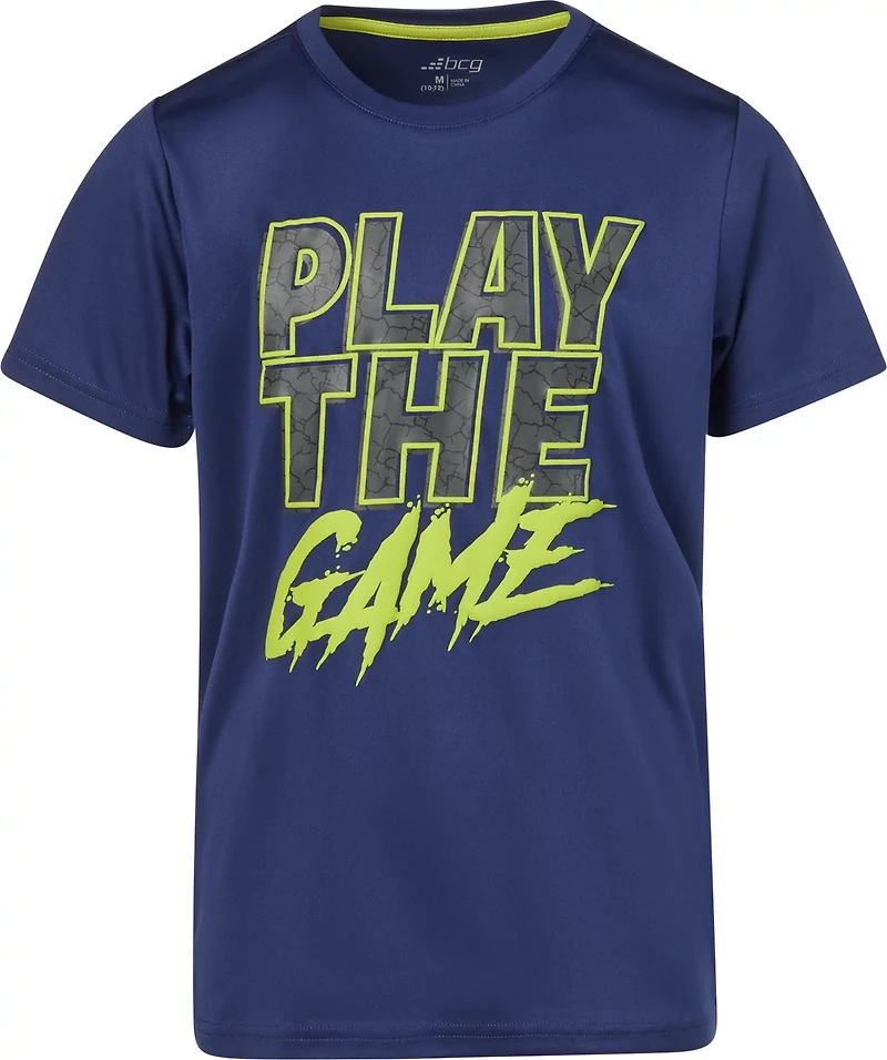 Sport the BCG Boys' Play Crackle Turbo T-shirt for both style and comfort. Made of 100% polyester for durability, this T-shirt features short sleeves and a crew neck. The T-shirt also comes with a graphic print on the front to add style.