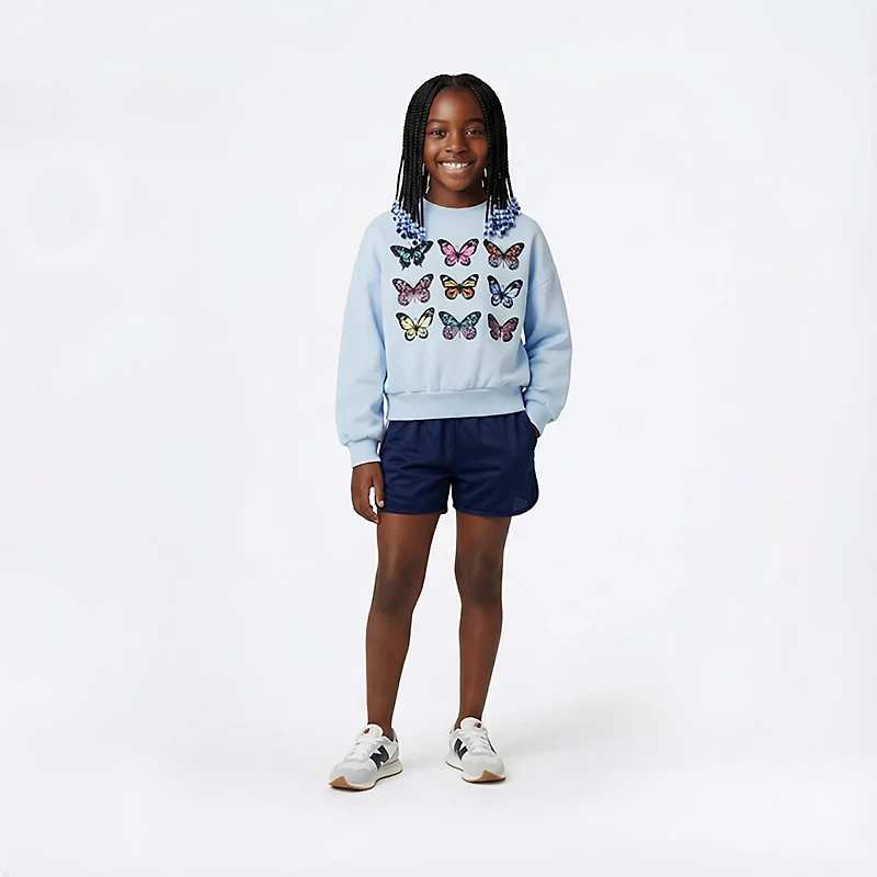 Stay cozy and stylish in this BCG Girls' Cotton Fleece Butterfly Cropped Crew. It boasts a cotton fleece construction for soft comfort and warmth, and the crew boasts a cropped fit to deliver a trendy look. Features a graphic design for a touch of cute style.
