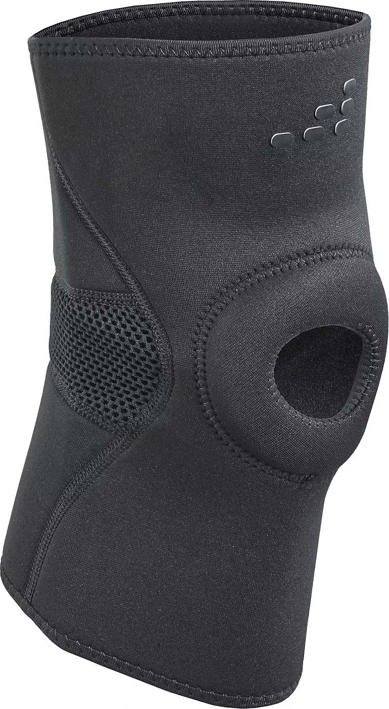 Move around with confidence while wearing the BCG™ Open Patella Knee Support. Made of a soft, durable neoprene blend to offer heat retention and improve circulation, this knee support is designed with a padded insert to enhance patella support and a vented back panel for breathable wear.