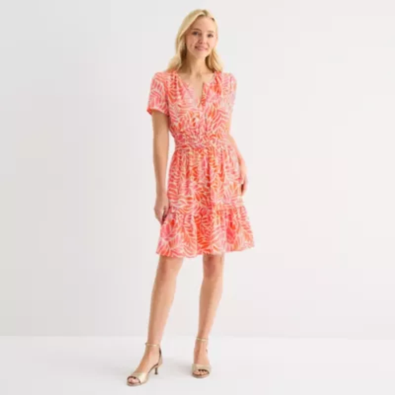 This Be by CHETTA B women's dress has a vibrant coral and white tropical leaf-print, making it the perfect addition to your summer or vacay wardrobe. This knee-length dress is made from a lightweight woven blend with a split crew neck, short sleeves and a fit and flare silhouette. Wear it with sandals and gold-tone jewelry.