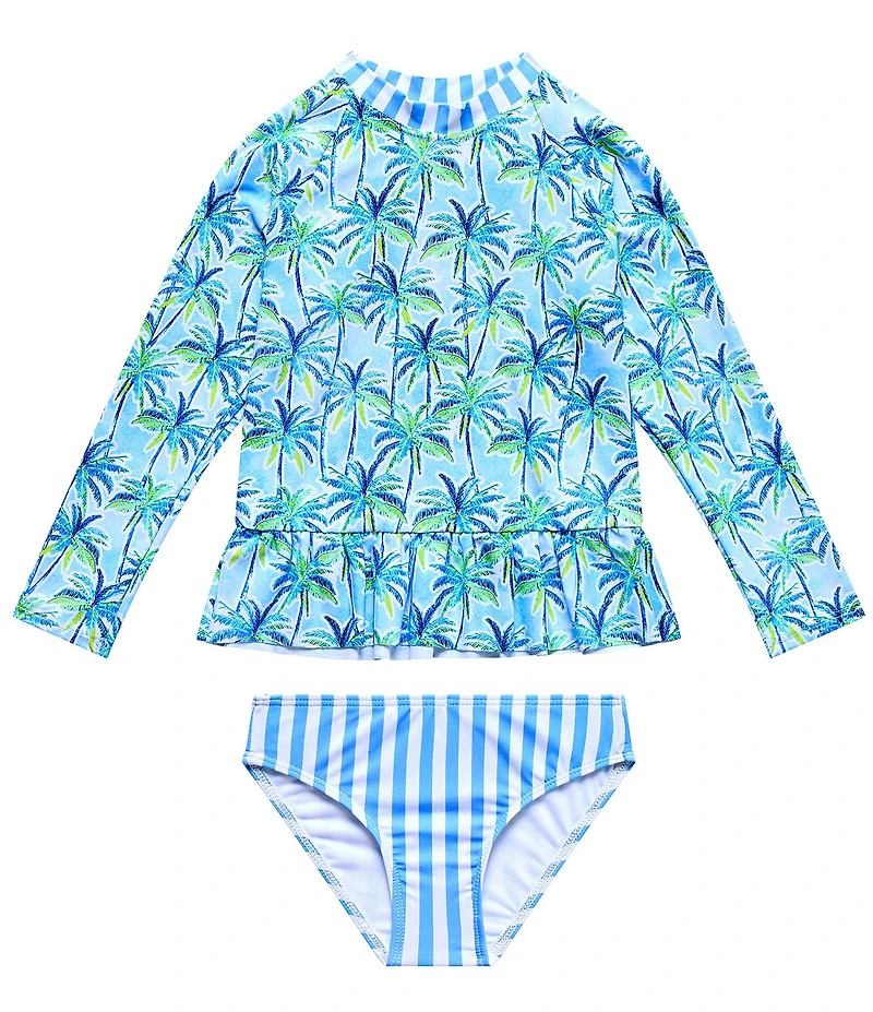 Beach Lingo Little Girl Long Sleeve Rashguard With Ruffle Waist And Hipster Bottom Palm Paradise 2 Piece Swimsuit