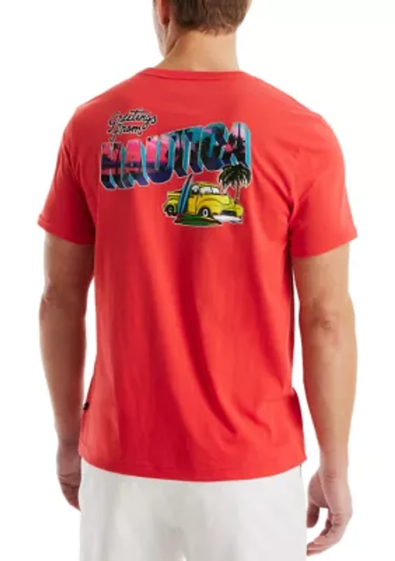 This graphic tee from Nautica is perfect for casual days. It's crafted from a soft cotton blend and features a small graphic on the chest and a large matching print on the back. Part of the Sustainably Crafted collection, this t-shirt is an eco-friendly choice. Pullover Crew neck Short sleeves Imported Material & Care Cotton, polyester Machine washable