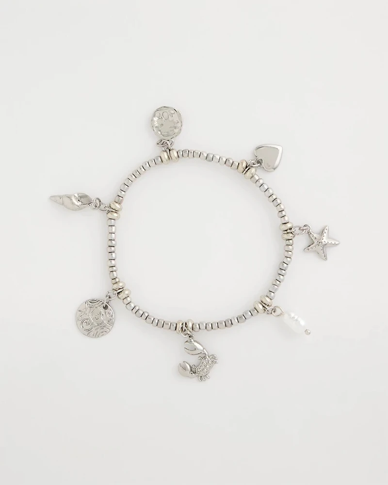 For the mermaid at heart, this shiny silver toned charm bracelet features our favorite sea critters and seashells strung from a chic matching beaded bracelet. Part of our Bracelet Bar — pair with pieces from this season and beyond.
