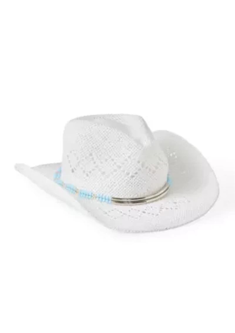 This Vince Camuto cowboy hat adds an Americana style to any outfit, with a beaded trim for Western flair. Imported Product Specifications 57cm , 9cm brim Material & Care Straw Spot clean only