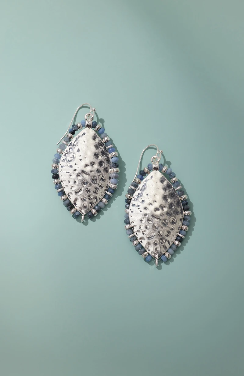 Our light-catching earrings feature hammered silvertone diamond charms rimmed with tiny blue beads for a subtle touch of wintry color. Fishhook.