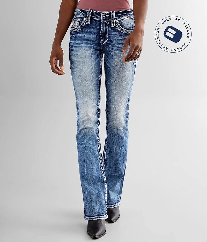 Mid-Rise Boot - A classic mid-rise with a higher waistline, crafted with quality fabric for a premium fit and feel. Mid-rise Slim through the hip and thigh 17" bottom opening Rhinestones and sequins on metallic embroidered faux flap back pockets Destructed pockets and hem details Shoe sku 957298 Model Info: Height: 5'7" | Bust: 34" | Waist: 27 1/2" | Hip: 35" | Wearing Size: 25x34