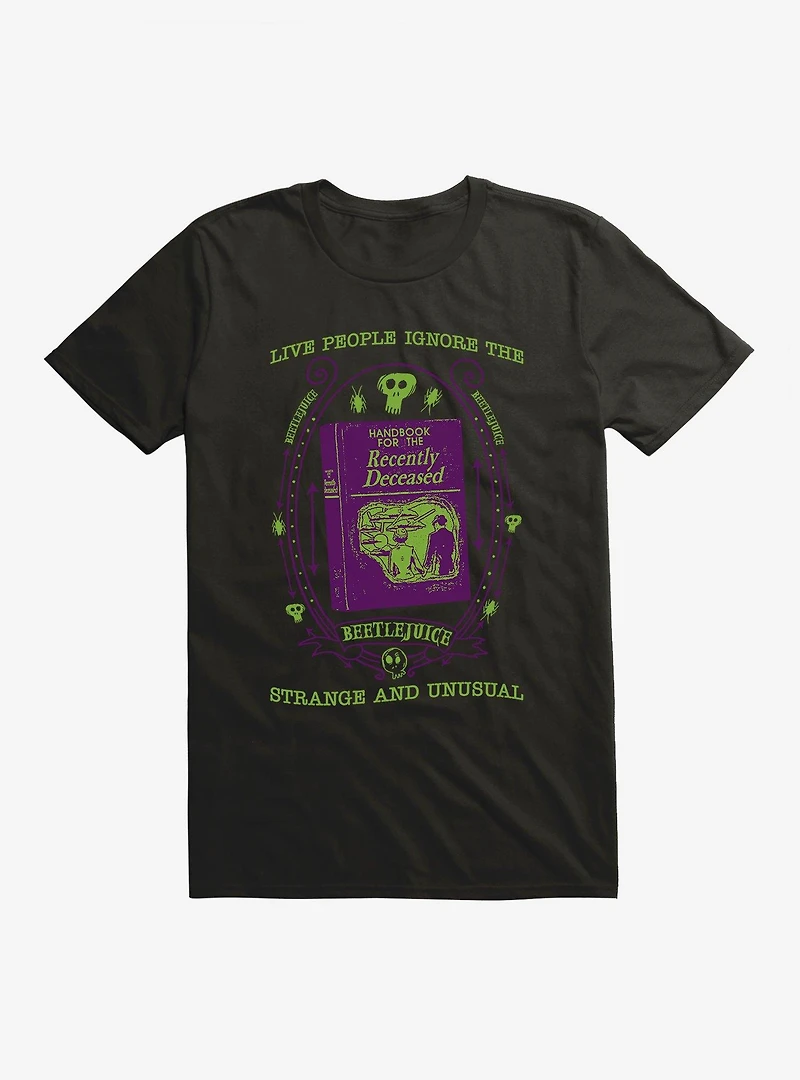 This Beetlejuice tee features an image of the Handbook for the Recently Deceased , with the following wise words from Lydia Deetz: "Live people ignore the strange and unusual."