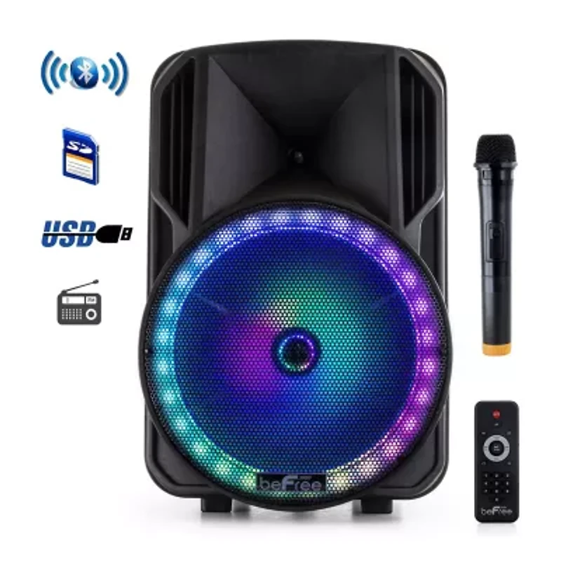 Get the good vibes going with the beFree Sound 12-inch portable part speaker. Bring it to any gathering or social event with its sturdy wheels and extendable handle for easy traveling. This all-in-one entertainment assistant is perfect for public speakers, motivational speakers, advertisers, and DJs as well. With the large variety of outputs, the party never stops! Plug in some RCA cables into your classy stereo system to amplify the sound. Enjoy some AM or FM radio and listen to your favorite shows out loud. Bring a USB flash drive or TF card as a backup music provider. Relax with friends and take turns passing the AUX around to show off newly discovered tracks. Wirelessly run music through the speaker with innovative Bluetooth technology. Don't be restricted by any cables, play straight from of your phone. Whether you're a bass line junkie or a treble head, enjoy your sound the way you want to hear it with bass and treble equalizer knobs. Turn on the party lights and get a rave going as the reactive LED lights put on a show. Comes with a microphone for public speakers and presenters who need their voice to be heard. This sound system is suitable for outdoor events thanks to the rechargeable battery. One full charge can last up to 3 hours. Use the remote to help control sound levels. Move some bodies with the 12-inch woofer and its power punch of sound. Even the wall flowers can enjoy the music from a far!