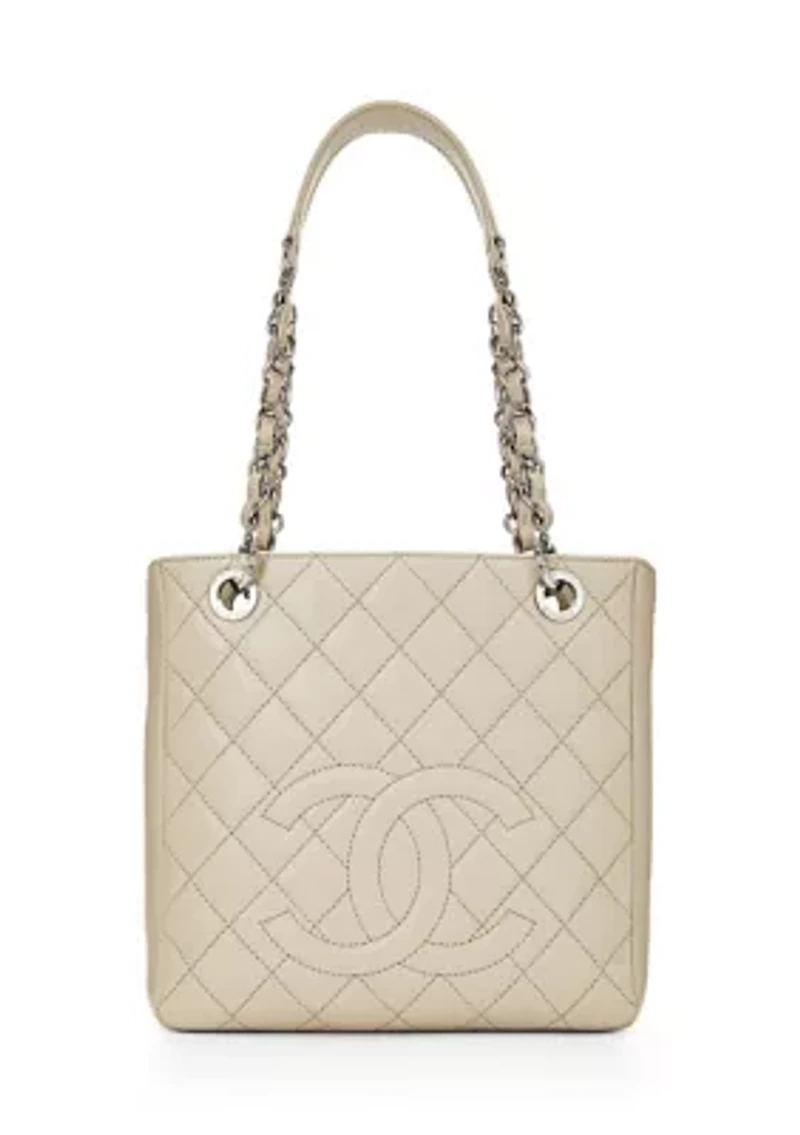 Item shows overall minimal wear. No Returns Accepted. All Sales are Final – No Returns or Exchanges Delivery of This Item Requires a Signature Although we try to select only the best product, your What Goes Around Comes Around item may have irregularities due to normal wear and tear. PREVIOUSLY OWNED Excellent condition A classic yet discontinued Chanel piece, this beige Petite Shopping Tote (PST) is rendered in the house's iconic grained Caviar leather with diamond quilting, interlocking 'CC' logo embroidery on front and accented with gold-tone hardware. Shoulder strap Slip and zip pocket Imported Product Specifications L 9.5" x H 9" x D 3" Material & Care Leather Spot clean only