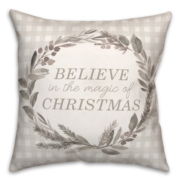 Our Believe in the Magic of Christmas Plaid Pillow is perfect for your farmhouse style home! The plaid print and neutral colors are sure to inspire the rest of your Christmas décor! Pillow measures 18L x 18H in. Crafted of spun polyester with polyfill Checkered plaid pattern Reads, "Believe in the magic of Christmas" inside a wreath Hues of beige and gray Features print on front and back Designed and printed in the United States Care: Spot clean only. This item is available at Kirklands.com only, not available in stores. Please note: this item cannot be shipped to APO/FPO addresses.