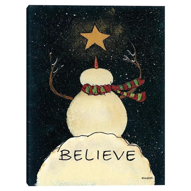 With its Americana style, this Believe Snowman Canvas Art Print radiates a cozy Christmas charm. Its sure to add a little magic to your walls this season! Art measures 24L x 1.5W x 36H in. Giclee printed on stretched, polycotton blend canvas Wrapped edges complete the look Snowman subject Features the word "Believe" Hues of black, white, yellow, red, green, and brown Artist: Lisa Hilliker Weight: 5 lbs. Hanging hardware not included Care: Dust with a soft, dry cloth. This item is available at Kirklands.com only, not available in stores. Please note: this item cannot be shipped to APO/FPO addresses.