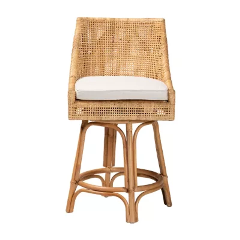 Encapsulate the charm of a tropical getaway in your space with the tranquil design of the bella counter stool. made in indonesia, this bohemian piece consists of a natural rattan frame wrapped in woven embellishments. the removable seat cushion is padded with plush foam and upholstered in soft fabric for superb comfort. the bella will arrive fully assembled and features ergonomic footrests on each side for enhanced relaxation. with a 360 swivel seat for enhanced leisure, the bella counter stool brings a serene aura to any arrangement.