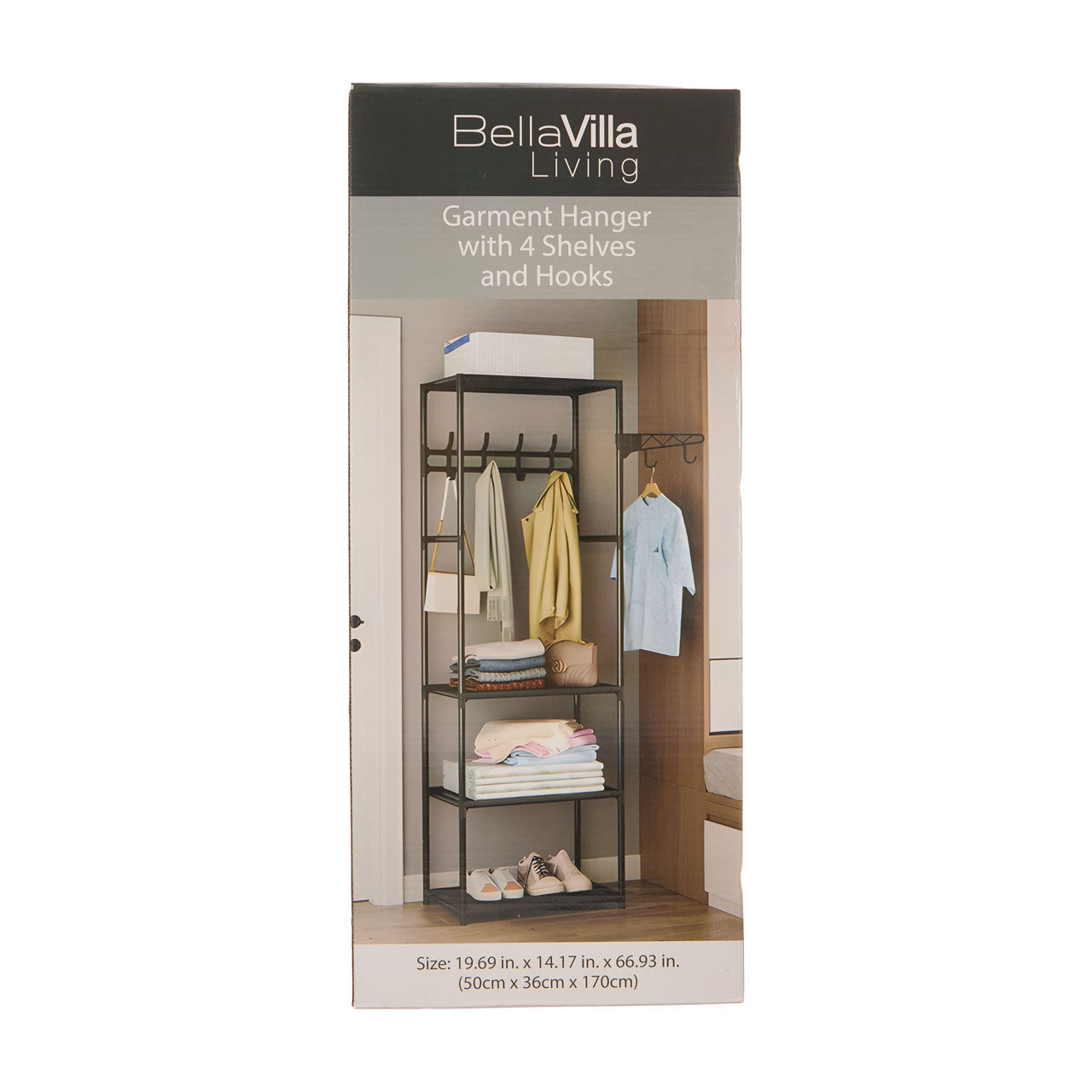 Transform your living space with the Bella Villa Living Garment Hanger, featuring four spacious shelves and convenient hooks. This versatile garment hanger is designed to keep your wardrobe organized and accessible, making it an essential addition to any home. Measuring 19.69 inches in width, 14.17 inches in depth, and 66.93 inches in height, this sleek and stylish unit fits perfectly into tight spaces while offering ample storage. The sturdy metal frame ensures durability and stability, making it ideal for daily use. The four shelves provide plenty of room for folded clothes, shoes, bags, and other accessories, while the hooks are perfect for hanging coats, jackets, shirts, and hats. This thoughtful design keeps your garments neatly arranged and easy to find, helping you maintain a tidy and clutter-free environment. Whether you place it in your bedroom, entryway, or walk-in closet, the Bella Villa Living Garment Hanger is a practical and chic solution for all your storage needs. Its modern aesthetic complements any decor, adding a touch of sophistication to your home.