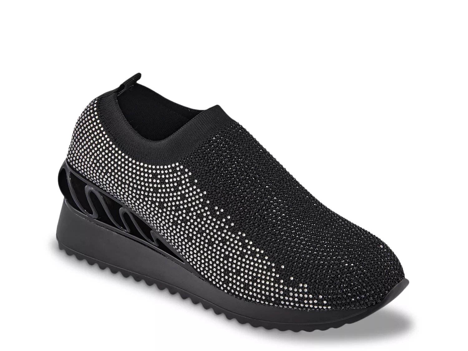 Take your fashion sense to new heights with the Bella wedge sneaker from Lady Couture. Multitonal rhinestone accents on a stretchy fabric upper and wavy heel design make this stylish slip-on a head turner from every angle.