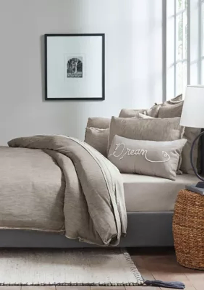 Inspired by Ellen's cool and casual style, the Belmont collection adds a timeless addition to your bedroom. This style is available in three unique pallets, a natural deep taupe, the smokey grey shades of soot, and the comforting tone of soft jade. The design has a cozy linen/frayed edge effect, constructed of 100% cotton providing the ultimate feel of true comfort and relaxation. This product is oeko-tex certified, which ensures these textiles meet high safety and environmental standards. The duvet features a button closure and interior ties to assist in keeping the insert in place. Insert is not included. Included shams feature a European side closure. The ensemble is machine washable and easy care to for. Twin duvet cover set includes: one twin duvet cover (86 in L x 66 in W) and one standard sham (20 in L x 26 in W). Full/Queen duvet cover set includes: one full/queen duvet cover (92 in L x 88 in W) and two standard shams (20 in L x 26 in W). King duvet cover set includes: one king duvet cover (92 in L x 106 in W) and two king shams (20 in L x 36 in W). Imported Material & Care Cotton Machine washable