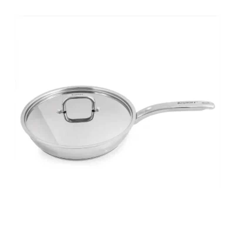 Berghoff's 18/10 stainless steel belly cookware collection, elegant beauty that will last for years. Crafted from hygienic 18/10 stainless steel with a mirrored finish, this cookware shows off sleek curves that accent each piece giving this cookware a unique and attractive look. Professional quality cooking with effortless cleanup. The belly 9.5" covered skillet can be used for a variety of meals. Braise carrots, Saute chicken, pan sear tuna or make your favorite risotto with ease thanks to the high sides that hold more liquid than your standard skillet. The stainless-steel lid allows you to cook more efficiently by securing heat inside. Our durable stainless-steel cookware, designed with versatility and functionality in mind, is built to withstand a lifetime of use in the home. Ergonomic, double-riveted stainless-steel handles provide a secure grip. High quality elements were put into every aspect of this cookware. The solid tri-ply base allows you to use on all cooktops including ceramic, gas, induction, electric, and glass. Please allow cookware to cool completely before attempting to clean. Dishwasher safe. Includes 1x covered skillet.