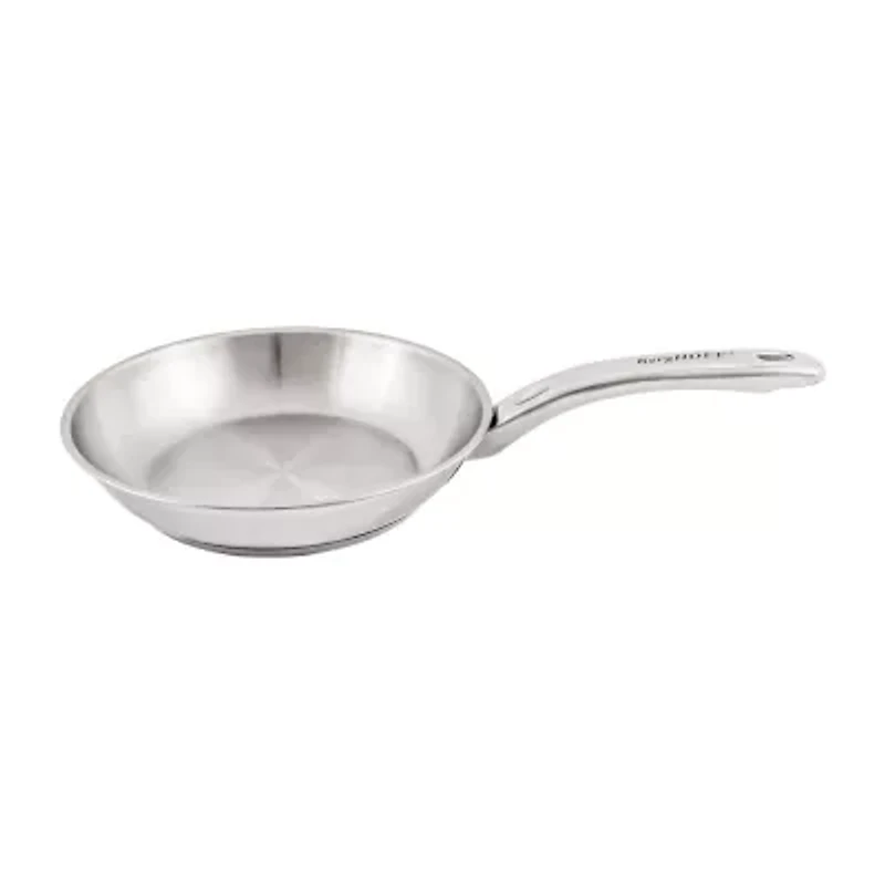 Berghoff's 18/10 stainless steel belly cookware collection, elegant beauty that will last for years. Crafted from hygienic 18/10 stainless steel with a mirrored finish, this cookware shows off sleek curves that accent each piece giving this cookware a unique and attractive look. Professional quality cooking with effortless cleanup. The belly 8" fry pan can be used for a variety of meals. Make your favorite omelet, fry some bacon, Saute chicken ‘n peppers for one, or even sear a steak and finish it in the oven. Our durable stainless-steel cookware, designed with versatility and functionality in mind, is built to withstand a lifetime of use in the home. Ergonomic, double-riveted stainless-steel handles provide a secure grip. High quality elements were put into every aspect of this cookware. The solid tri-ply base allows you to use on all cooktops including ceramic, gas, induction, electric, and glass. Please allow cookware to cool completely before attempting to clean. Dishwasher safe.