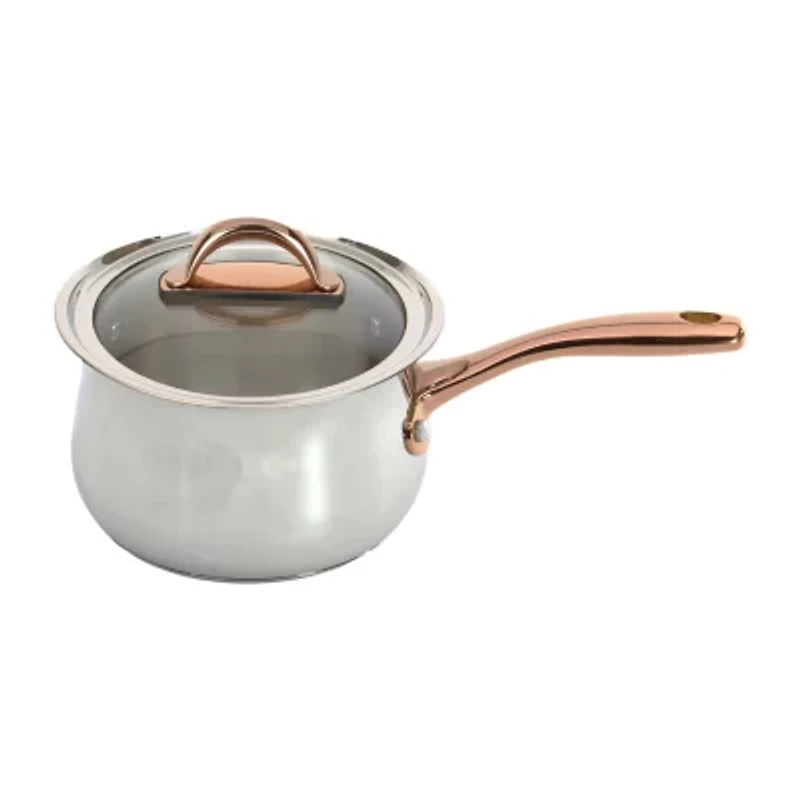 Berghoff's ouro gold cookware, timeless beauty that will last for years. Crafted from tri-ply hygienic 18/10 stainless steel with a mirrored finish, this cookware comes with beautiful rose gold accents on the handles giving this set a unique and attractive look. Professional quality cooking with effortless cleanup. The ouro gold 6.25", 2.4qt covered saucepan can be used for a variety of meals. Make your favorite homemade sauces, gravy, beans, veggies, or simply boil water, heat milk, and even prepare small portions of pasta. The glass lid allows you to keep a close eye on what is happening in the pot without allowing valuable heat to escape. Our durable stainless-steel cookware, designed with versatility and functionality in mind, is built to withstand a lifetime of heavy use in the home. Ergonomic, double-riveted stainless steel rose gold handles with copper inlay provide a secure grip. High quality elements were put into every aspect of this cookware. The solid base allows you to use on all cooktops including ceramic, gas, induction, electric, and glass. Please allow cookware to cool completely before attempting to clean. Dishwasher safe.