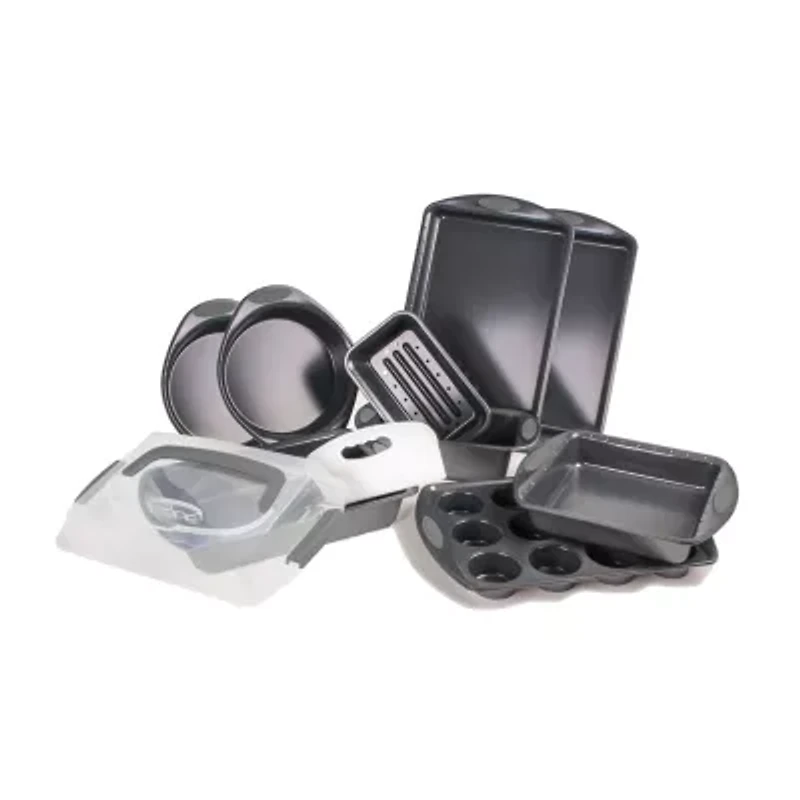 Included: 1 12-Cup Muffin Pan(s), 1 9 Inch Square Cake Pan(s), 2 9 Inch Round Cake Pan(s), 2 10 X 15 Inch Cookie Sheet(s), 1 9 X 13 Inch Cake Pan(s), 1 Lid(s), 1 Cake Slicer(s), 1 Slotted Loaf Pan(s), 1 Loaf Pan(s)
